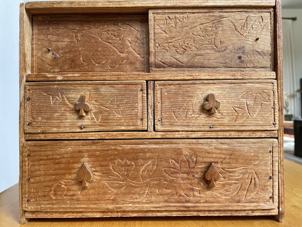 When my mother entrusted to me the fragile small tansu chest that her father made for her in camp out of crate wood, she told me that her father had felt sorry for her that she didn’t have anyplace to store her belongings. To improve the appearance of the wood, my grandfather placed a hotplate on the pieces to deepen the grain. My mother appreciated the care he took to carve traditional Japanese scenes onto the panels with a pen knife. She said the chest represented to her the depth of her father’s love.