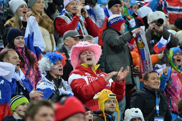 Spectators put on jackets, hats and layers to watch the biathlon race at the 2014 Olympics in Sochi, Russia.